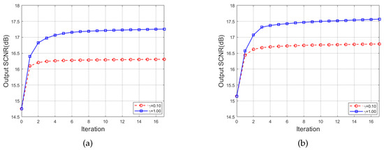 Variation of the system output SCNR with the number of iterations. (a) . (b) .