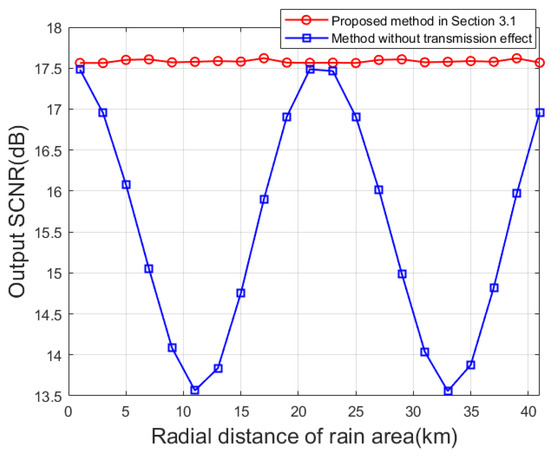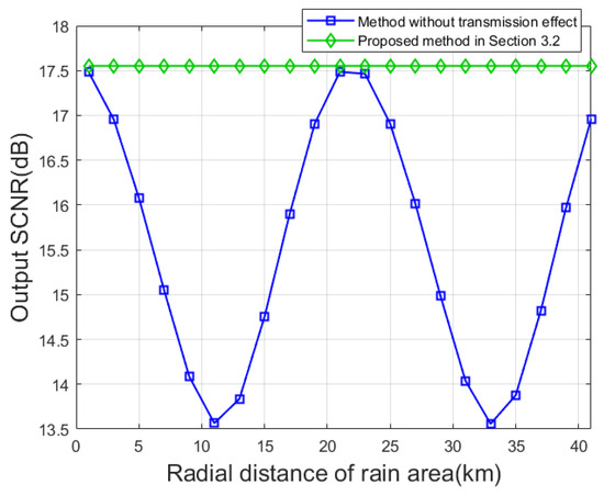 When the rainfall information is unknown, we make and in this section based on the rain area parameters set in Section 4.1 and the empirical data. The method’s performance is initially validated from the standpoint of SCNR. Following a similar analysis method as depicted in Figure 8, comparison between the method in Section 3.2 and that in the literature [32] of Figure 10 demonstrates that the method proposed in Section 3.2 significantly enhances SCNR while ensuring good robustness.