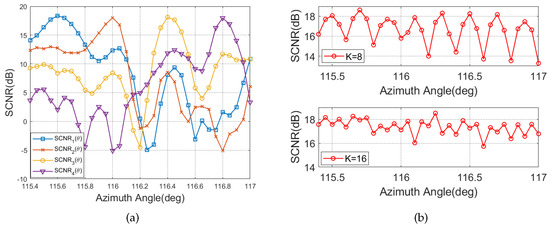 In this subsection, we evaluate the effect of TAA uncertainty and filter bank size on the performance of the method in Section 3.1. The TAA uncertainty range is chosen to be , and the three filter bank sizes are considered separately. The under is given in Figure 9a. From the figure, it can be seen that due to the finite number of filters, a single filter can only match part of the angle, which brings about a SCNR loss. For further analysis, Figure 9b gives the variation of with for the and conditions. The larger the K is, the smaller the SCNR loss, which is due to the fact that the increase in the number of filters improves the robustness of the system to the uncertainty of the TAA.