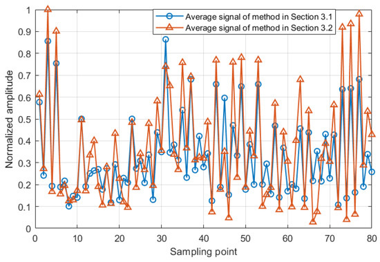 Both methods in Section 3.1 and Section 3.2 are able to improve the system output SCNR through transmit signal design. Figure 11 compares the average waveforms designed by the two methods at different distances from the rain area. It is noteworthy that the transmit signals designed by the two methods exhibit strong correlation, and the correlation coefficient coeff = 0.9642 is calculated. Combined with Figure 10, it proves the effectiveness of the methods in Section 3.2 in improving the SCNR for the radar detection if the rainfall information is not provided.