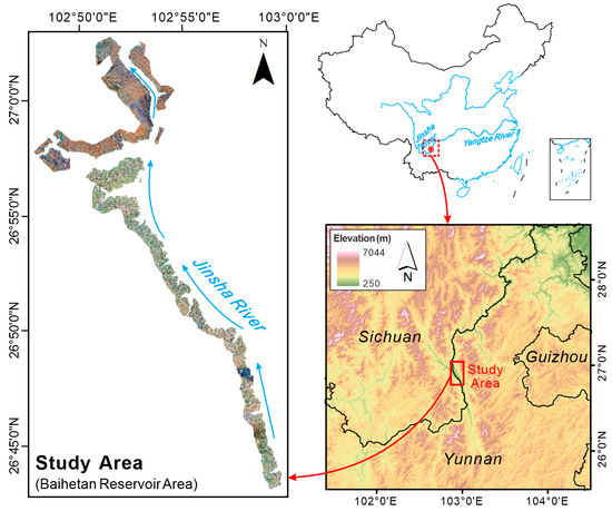 The Baihetan reservoir was formed after the Baihetan hydropower station began storing water in April 2021, with a total storage capacity of 20.627 billion m3 [35]. The storage of water has changed conditions such as the groundwater level and pore water pressure on the slopes [36], leading to the continuous development of a series of landslides within the reservoir area [16,37,38]. The activity of the landslides has affected the production and traffic of towns along the river within the reservoir area, and the potential impulse wave risk of the landslides also poses a significant threat to the downstream Baihetan hydropower station. In this study, a UAV image dataset obtained from the Baihetan reservoir in the lower reaches of the Jinsha river in China is employed as the data source for model training and validation.