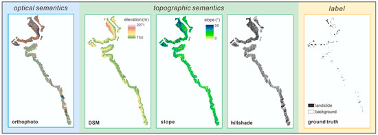 There are three types of image data used as inputs for the semantic segmentation model, which can be summarized as follows: optical semantic data, topographic semantic data, and label data. The optical semantic data are represented by orthophoto, while the label data are obtained by landslide experts who observe the orthophoto and annotate it using ArcGIS software. Here, it is worth mentioning the selection of topographic semantic data. We ultimately chose relative elevation, slope, and hillshade as the three types of data to collectively constitute the topographic semantic data used for input (Figure 4).