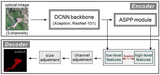 Therefore, the topographic information in the UAV datasets would be lost by using the general DeepLabV3+. For this reason, in order to achieve a landslide semantic segmentation model with good generalization performance, we re-designed a new DeepLabV3+-based semantic segmentation model for landslide recognition that includes topographic information.