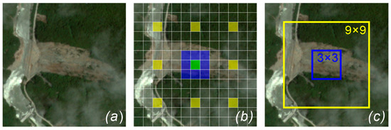 The dilated convolutions with a dilation rate of 4 bring an expanded receptive field to a 3 × 3 convolutional kernel: (a) an orthophoto including an entire landslide; (b) feature pixels corresponding to dilated and standard convolutions (yellow: feature pixels for dilated convolution; blue: feature pixels for standard convolution; green: feature pixels for both dilated and standard convolution); (c) schematic of the receptive field area.