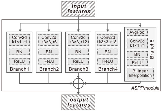 Relying solely on dilated convolution can effectively expand the receptive field, but it does not achieve unified feature extraction for multi-scale objects. To address the issue of multi-scale feature extraction, Spatial Pyramid Pooling (SPP) has provided an excellent practical approach—establishing multiple parallel branches and using pooling operations with different kernel sizes in each branch to extract and ultimately integrate multi-scale features [50]. On the other hand, as mentioned above, dilated convolutions can be seen as a non-downsampling alternative to pooling operations. Naturally, the idea arises to use dilated convolution operations to replace the pooling operations in some branches of SPP, giving rise to Atrous Spatial Pyramid Pooling. Since dilated convolutions do not change the size of the feature map, this substitution allows the output results of each branch to be directly concatenated in the channel dimension (except for the pooling branches, which require upsampling), resulting in a multi-scale feature map that fully accounts for the features of objects at different scales. Figure 9 shows the basic structure of the ASPP module.