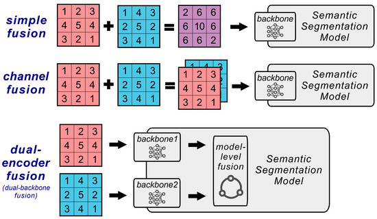 In order to design a landslide recognition model that fuses both optical and topographic semantics, it is first necessary to consider the fusion strategy. In deep learning tasks for computer vision, common data fusion methods can be categorized into three types: simple fusion, channel fusion, and dual-encoder fusion (Figure 10). Simple fusion is considered the most basic form of data fusion, where two sets of data are directly added or multiplied together. This method necessitates high consistency between the two datasets and is typically used for fusing intermediate features within the network [51,52,53]. Channel fusion concatenates optical and topographic data along the channel dimension before its input into the model, thus better preserving the original characteristics of the data [54,55,56]. Dual-encoder fusion (also known as dual-backbone fusion) goes a step further by feeding each data set into an encoder (which is primarily composed of a backbone) and the features outputted by the encoders are then fused at the model level (usually through direct channel fusion) [57,58,59]. Compared to the other methods, dual-encoder fusion is the most complex, but it allows the data to undergo several layers of neural network processing both before and after fusion, thereby enabling a true deep fusion of data.