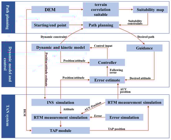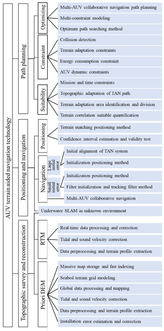 Underwater TAN, gravity-field-matching navigation [], and geomagnetic-field-matching navigation [] are all components of geophysical-information-matching navigation. They were initially used for spacecraft navigation in communication-constrained and -denied spaces. One of the most famous applications is the Terrain Contour Matching (TERCOM) system, which was installed on U.S. prisoner-of-war cruise missiles. TAN is also of great importance in the aerospace field [,], such as in the landing process of Mars probes [,,]. Deep-sea spaces are typical communication-constrained environments, and high-precision navigation has always been a technological bottleneck that must be overcome for the long-duration, long-range, and fine-grained operations of underwater vehicles. In the 1980s, the Norwegian Defence Research Establishment (FFI, Forsvarets forskningsinstitut) introduced TAN technology into the field of underwater navigation. It successfully developed the underwater TAN system “TerrNav” and the experimental platform “TerrLab” [,]. During the past four decades, the development of underwater TAN technology has led to the formation of a relatively complete theoretical and technical system (Figure 1). The theoretical and technical system of underwater TAN mainly includes three parts: terrain measurement and restructuring [], TAP [,], and the path planning of underwater TAN []. Among them, terrain measurement and reconstruction include measuring and reconstructing the global a priori DEM and the real-time measured terrain map, on which the relevant research is already very comprehensive. TAN/TAP and TAN path planning are the current research hotspots of TAN. TAP research mainly involves single-point TAP estimation [], continuous recursive positioning estimation [,], and positioning in terrain-unknown environments []. TAN path planning mainly involves Terrain Adaptability Analysis [], path search, and optimization methods [].