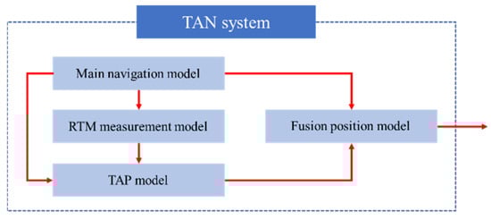 Another structural mode of the TAN system is the tightly coupled mode, as shown in Figure 4. In this structure, the main navigation system outputs attitude information, velocity information, and other parameters to the TAN system. The TAN filter utilizes velocity information, attitude information, and terrain measurement information to perform positioning estimation. Furthermore, the main navigation system independently performs positioning estimation and outputs the positioning information separately, without interfering with the TAN positioning information. The state transition equations for this structure are shown in Equation (2), where the first equation describes the state transition of the main navigation system, and the second equation represents the state observation equation based on terrain matching.