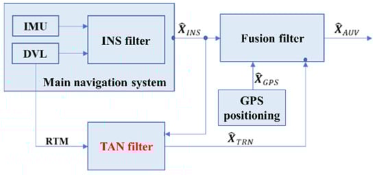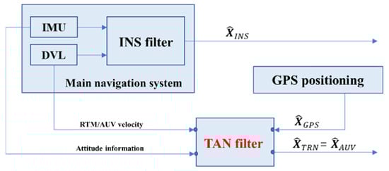 The tightly coupled navigation filtering mode is generally used for TAN estimation with low-cost sensor systems. For AUVs equipped with high-precision main navigation systems, the loosely coupled navigation filtering mode is typically employed.