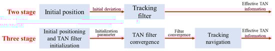 Underwater TAN systems utilize terrain feature matching and tracking for position estimation. Prior to providing accurate positioning information, the navigation coordinate system must be aligned with the spatial coordinate system of the terrain map. Subsequently, the TAN system performs continuous position estimation and outputs stable results by matching and tracking the underwater terrain features. In a previous study [], the operation of underwater TAN systems was divided into two stages: initial positioning and tracking navigation. The primary objective of the initial positioning stage is to correct the accumulated time error of the main navigation system using high-precision TAP methods. This ensures the rapid convergence and stable output of the system within a short period and distance. However, the tracking positioning stage involves fusing the positioning information from the main navigation system with the TAP information, enabling continuous recursive estimation of the position and the provision of reliable positioning information. With the increasing diving depth and range of AUVs, larger initial positioning deviations can lead to challenges, such as slow convergence or even the divergence of the filtering process during the initial stage [,,]. Therefore, the issue of convergence during the initial stage of underwater TAN systems has attracted significant attention. Comparative studies [,] have investigated the effects of different initial positioning and filtering initialization methods on navigation accuracy. These studies have shown that convergence errors and speeds during the initial stage affect the final positioning accuracy. Moreover, filter convergence serves as the foundation for reliable system operation and the generation of valid positioning information. Thus, considering system reliability, the operational stages of underwater TAN systems should encompass the initial positioning and filter initialization, the navigation filter convergence stage, and the tracking navigation filter stage, as depicted in Figure 5. The Primary algorithms utilized in the three operational phases of TAN is shown in Table 2.