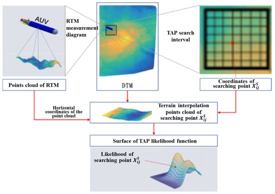 Underwater TAP estimation involves approximating the probability distribution of an AUV at a search point based on the likelihood estimation of the RTM terrain and the prior terrain. This estimation can be considered the position points of the AUV and their probability distribution in the terrain space, serving as a primary source of positioning information for underwater TAN systems. During the initial stage of system operation, TAP estimation can be used to obtain the initial position points and probability distribution estimation of the system. In the tracking filtering stage, the filter combines information from TAP with the main navigation system to output TAN positioning information. Commonly used underwater TAP methods include point-cloud-based- and image-based matching methods.