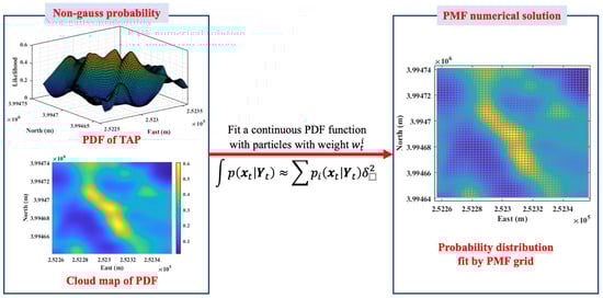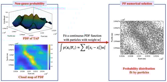 The FFI was one of the earliest research institutions to apply TAN technology to underwater navigation [,,,]. In the 1980s, FFI researchers introduced nonparametric filtering methods for state iteration estimation in TAN systems. The FFI also developed the TERLAB simulation platform specifically for the research on and application of underwater TAN technology []. Subsequently, an increasing number of researchers have studied underwater TAN technology based on PF methods. PFs approximate probability distributions with randomly distributed particles that convert an integral operation into a summation operation (Figure 8). Therefore, it can be very convenient to solve non-Gaussian problems and integral operations without analytic representations.