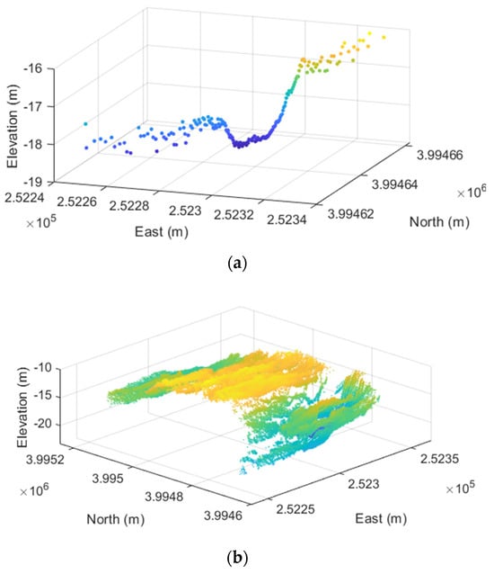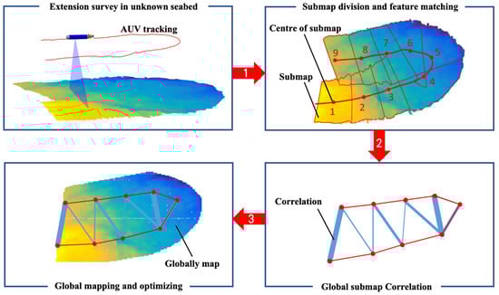 With the rapid development of underwater robotics technology, an increasing number of research institutions have focused on developing deep-sea terrain mapping techniques based on underwater robotic platforms. These techniques show promise for improving the accuracy and efficiency of deep-sea terrain mapping. In one study [], a technique for underwater terrain mapping based on an AUV platform was devised. This technique utilizes a multibeam sonar system mounted on an AUV to measure seabed profiles. The obtained profile information is then integrated with the AUV navigation system to compute the terrain profiles in the geodetic coordinate system, making autonomous underwater terrain mapping possible by using an AUV. However, because of the accumulation of errors in the navigation coordinate system of an AUV over time, it is challenging to achieve long-term and large-scale terrain mapping. In another study [], a methodology was proposed for processing 3D multibeam sonar big data based on the stepwise processing of a dataset with 3D models and isoline map generation that makes fast processing possible, and the obtained DEMs were of good quality.