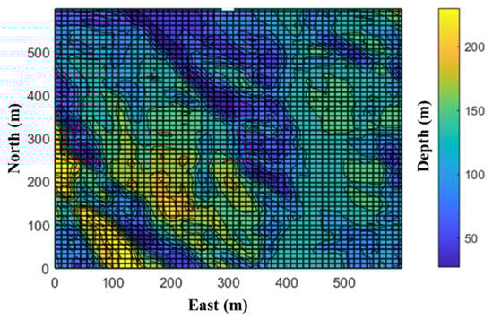 Adaptability quantification aims to evaluate the adaptability of the terrain quantitatively based on the terrain feature parameters and to divide the terrain map optimally into highly and poorly adaptable regions. In a previous study [], an optimal partitioning method for terrain adaptability based on a terrain spatial standard grid was investigated. This method divides the terrain space using standard grids and obtains the optimal grid-based terrain map by maximizing the allocation of highly and poorly adaptable regions to different grids []. Figure 13 shows the grid-based results of the prior terrain map obtained using the method proposed []. The grid is determined based on the principle of optimal segmentation according to adaptability, in which highly and poorly adaptable regions in the terrain map are optimally allocated to different grids. Figure 14 shows the quantified values of terrain adaptability in each grid under the optimal grid partitioning.