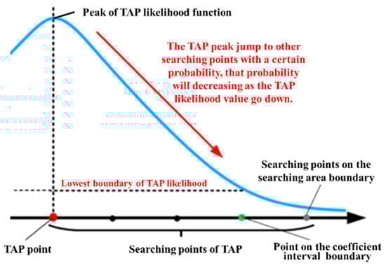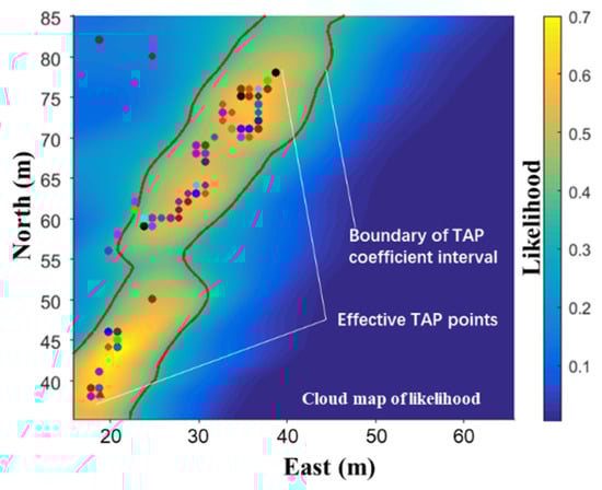 where  represents the predicted positioning probability distribution of the underwater TAN system at time ,  represents the posterior corrected probability of TAP in the underwater system,  is the normalization parameter related to the terrain measurement error,  represents the probability distribution of the propagated navigation system estimated position (where  is the system state input information from time  to ),  is the system state at time ,  represents the integration range for solving the probability distribution of underwater TAN positioning, and  represents the conditional distribution probability of observation value  obtained by  at time . Equations (7) and (8) make it possible to estimate the TAP points.