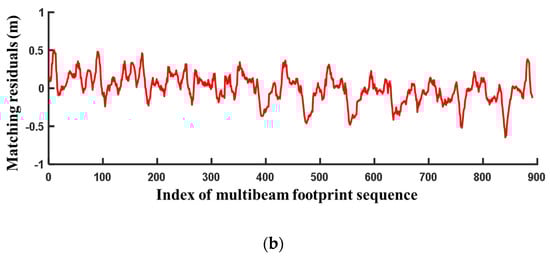 In the equations,  represents the state transition equation with an input covariance matrix . In addition,  represents the measurement equation with a measurement error of , where  represents the indices of two different measurement frames that form a loop closure. Moreover,  represents the set of indices of all measurement frames that form loop closures,  represents the actual terrain elevation measurement sequence,  represents the position information of the AUV,  represents the optimized trajectory of the AUV, and  represents the length of the AUV state sequence.