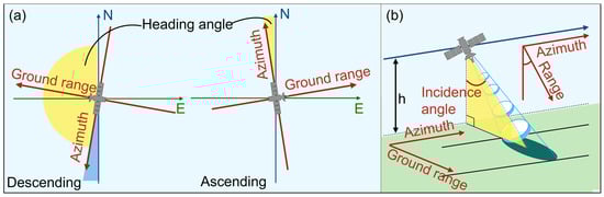 SAR acquisition geometry: (a) heading angle for descending (left) and ascending (right) passes; (b) incidence angle.