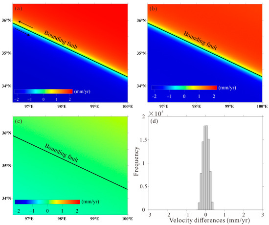 We tested the performance of the proposed method in correcting orbital errors with different image partition strategies (namely, different choices of N), and the results are presented in Figure S2. As depicted in Figure S2a, the peak deformation rates towards and away from the satellite sensor are 1.95 mm/yr and 1.98 mm/yr, respectively, and 68.4% of the velocity differences in Figure S2b are less than 0.2 mm/yr. Figure S2c,d illustrate the solution obtained with N = 6, which exhibit the highest velocity of 1.98 mm/yr towards the satellite and a maximum of 2.00 mm/yr away from the satellite. Additionally, 73.4% of the velocity differences in the solution are smaller than 0.2 mm/yr. The three velocity maps (Figure 1b and Figure S2a,c) generated using different values of N (N = 2, 4, 6) exhibit a high degree of agreement, indicating that the solution is independent of the selection of N when the locking depth and slip rate are unique along the bounding fault. Table S1 shows the solved tectonic velocity constants of sub-patches with different N values. It can be found that the solved velocity constants are stable. This indicates that the sub-patch number N is also not a fixed value. When an N value caters to explaining the rate map characteristics for a certain study area, any greater N value might yield a similar solution. Therefore, the N value could be determined by a brute-force searching with an interval of 2.