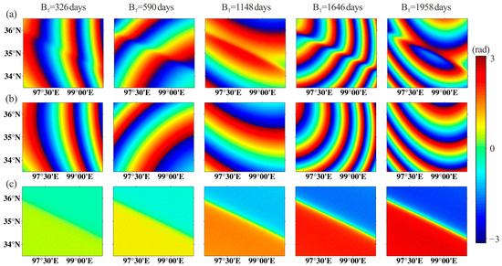 The proposed orbital correction method is applied to the simulated data sets. The simulated SAR deformation field extends pretty far from the boundary fault, and hence we choose the typical critical distance of 30 km. Considering that the whole simulated fault segment shares the same locking depth and slip rate, there is thus no need to differentiate the far-field region along the strike, the selection of N = 2 is appropriate. Figure 2b shows the estimated orbital ramps corresponding to the example interferograms mapped in Figure 2a, and the related corrected interferograms are presented in Figure 2c. It can be seen that after removing the estimated orbital surfaces, the distribution patterns of the remaining phases in the corrected interferograms are familiar to each other, and the phase magnitudes increase with the temporal baseline.