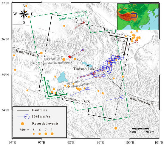 - Zhu, L.; Ji, L.; Liu, C. Interseismic slip rate and locking along the Maqin–Maqu Segment of the East Kunlun Fault, Northern Tibetan Plateau, based on Sentinel-1 images. J. Asian Earth Sci. 2021, 211, 104703. [Google Scholar] [CrossRef]