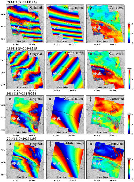 The presented approach of mitigating orbital errors is also applied to the analysis of multiple real SAR interferometric pairs along the Tuosuo Lake segment. In the orbital correction, the critical distance is also set as 30 km, due to the perfect cover of the used Sentinel SAR images. Comprehensively considering the a priori information including the variations of locking depths and slip rates along the Tuosuo Lake segment from the previous study by Zhao et al. [30] and the differences of fault strikes in different fault parts [18] within the SAR coverage, we divide the far-fault region of the used SAR images into six sub-patches. The examples of ascending/descending interferograms before/after the orbital correction are shown in Figure 4. It is shown that the tectonic signals can be well isolated from the orbital errors even though the orbital errors are much more significant than the tectonic deformation, verifying the effectiveness and applicability of our developed method.