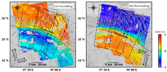 InSAR interseismic LOS velocity fields around the Tuosuo Lake segment of the Kunlun fault derived from ascending (a) and descending (b) tracks. The blue color represents a radar range increase and the red color means a range decrease. Black dashed rectangles indicate the patches with different average strikes.