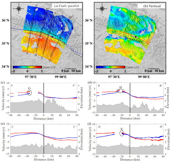 Fault-parallel (a) and vertical (b) components of the InSAR-derived average-velocity fields. The red solid line, black dashed line and blue dashed line show the InSAR-derived fault trace, the fault trace from the study by Deng et al. [45], and the one mapped by Styron and Pagani [46]. (c–f) Fault-perpendicular velocity profiles (AA’, BB’, CC’, and DD’) from InSAR measurements with orbital correction using our proposed method (Figure 6a) are colored in red, and the blue velocity profiles are associated with the traditional quadratic approximate of orbital errors (Figure S5c). Dashed ellipses marked by G, H and K indicate InSAR measurements probably affected with residual atmospheric delay.