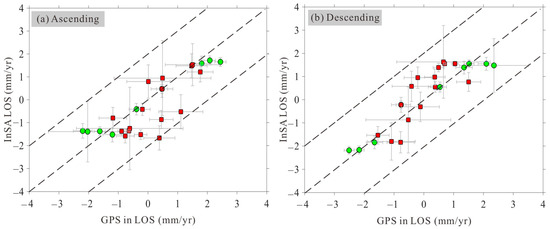 Comparison between InSAR-derived LOS and LOS projection of GPS-derived horizontal velocities along ascending (a) and descending (b) tracks. The green and red dots are, respectively, related to the GPS observations from the studies by Wang and Shen [39] and Diao et al. [40].