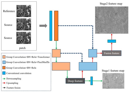 High-resolution optical satellite imagery, while offering expansive coverage and rich ground object data, is susceptible to factors such as illumination and occlusion. Directly inferring a height map from original images can lead to inaccuracies due to incomplete information, thereby impeding the reconstruction of DSM. Within the realm of image processing, feature extraction plays a pivotal role, influencing the ultimate outcomes of subsequent processing tasks. This process primarily encompasses feature engineering techniques and deep learning methodologies. As a subset of feature engineering, feature extraction functions as a data compression mechanism. However, the compressed feature data retain significant portions of the original image content, mitigating noise and superfluous data. This streamlined approach not only reduces memory overhead but also facilitates rapid processing. Depending on the specific application, emphasis may be placed on attributes such as color, texture, spatial positioning, and shape [33,34]. Deep learning-based feature extraction offers automated feature learning capabilities. Its end-to-end training obviates the need for manual feature extractor design, ensuring efficient extraction of image data. Given its robust learning prowess, it adeptly captures nuanced features while concurrently attending to diverse types of information [35]. Consequently, it has emerged as the preferred method for satellite image feature extraction. The feature extraction module proposed in this study integrates Transformer self-attention with a CNN. This integration employs a U-net encoder–decoder structure to extract both shallow and deep features, thereby enhancing the network’s representational capacity. Furthermore, it adopts PixelShuffle as an alternative to deconvolution for upsampling. This approach not only reduces the parameter count but also ensures the extraction of crucial feature information, as illustrated in Figure 2.