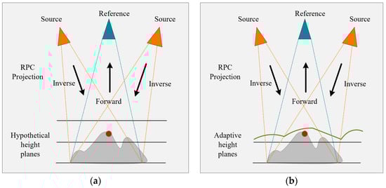 Affine transformation procedure of the RPC model. (a) The first stage uses a hypothetical height plane, and (b) the second stage uses adaptive height planes.