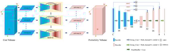 Noise present in satellite remote sensing images, stemming from factors such as occlusion and illumination, compromises the precision of multi-view stereo matching. Consequently, it becomes imperative to smooth the cost volume. Traditionally, this is achieved through either 3D or 2D convolution, which, however, are associated with suboptimal computational efficiency and significant memory consumption. This paper introduces an enhancement to the GRU recurrent encoder–decoder structure by incorporating a regularization operation for each stage’s constructed cost volume. Subsequently, a softmax operation is executed along the height direction to yield the normalized probability volume. This volume signifies the likelihood of a pixel residing within the current height plane, thereby delineating the confidence level of the height estimate. When juxtaposed with the 3D convolution method [27], the GRU regularization approach coupled with the recursive encoder–decoder structure sequentially regularizes the cost map along the height dimension. This results in enhanced efficiency and reduced memory overhead, proving advantageous for processing expansive satellite images with extensive height search capabilities.