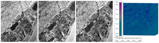 This paper utilizes the published WHU-TLC dataset, sourced from the three-line array camera (TLC) installed on our country’s ZY-3 satellite. The forward-looking camera captures images with a ground resolution of 2.1 m, while those captured by both forward- and backward-looking cameras have a resolution of 2.5 m. The overlap rate of these three views exceeds 95%, making them suitable for DSM reconstruction. The parameters of the satellite camera are incorporated into the provided RPC model and have been pre-calibrated for subpixel reprojection accuracy, allowing for direct use post-parsing. The model evaluation employs the inaugural version of large-scale satellite images, comprising 173 groups of images. Each group consists of 16-bit panchromatic resolution tri-view satellite images measuring 5120 × 5120, accompanied by the corresponding RPC parameters. Additionally, it includes ground truth DSM generated by photogrammetry software, supported by high-precision lidar observations and ground control points. An example of a large-size dataset is shown in Figure 8, which displays satellite images from three different viewpoints and ground truth DSM from left to right, covering an approximate area of 125 km2.