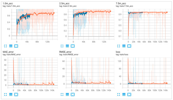 During the training phase, the batch size was set to 1, and RMSprop [41] was chosen as the optimizer for weight parameter updates. This selection incorporated a decay factor to regulate the descent speed of second-order gradients. The network model training employed a straightforward cross-validation method, with the training efficacy being validated after each epoch of training for one epoch. Based on these validation results, hyperparameters could be adjusted in real time, allowing for an initial estimation of model performance. All modules underwent iterative training for 25 epochs, starting with an initial learning rate of 0.001. A dynamic learning rate adjustment was implemented, reducing the learning rate by a factor of two after the 6th, 8th, and 12th epoch, respectively. The model training process was visualized using the Tensorboard tool [42], as depicted in Figure 10. As the number of iterations increased, saturation was observed in various indicators, leading to rapid convergence of the weight parameters towards their optimal values.