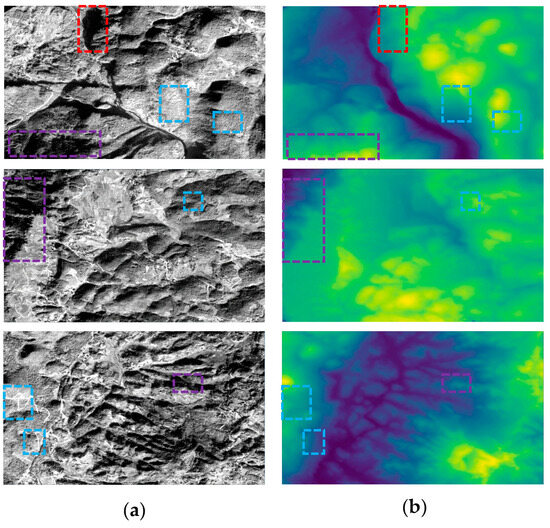 Satellite images, because of their expansive coverage and rich ground information, are often subject to various factors that can impact image quality. These include the conditions of the observation equipment, natural phenomena such as clouds and fog, and the transmission technology used, all of which can adversely affect image-processing tasks. In the context of 3D reconstruction tasks based on satellite images, three primary factors influence reconstruction performance including image area discontinuity, occlusion or illumination conditions, and weak texture. The efficacy of the model presented in this paper is evaluated through the visualization results of three sets of images and height maps utilized in the experiment. Figure 12a,b show the reference images of three sets of satellite images in a small-sized dataset and the corresponding height map estimation results, where the red box indicates a discontinuous area. It is evident that there is a significant pixel value difference between this area and its adjacent areas in the reference image, leading to matching difficulties. However, the model proposed herein employs a self-attention method, learning the correlation among adjacent pixels, thereby accurately predicting the height value of this area range. The purple box represents a darker area, which may cause mismatching due to insufficient illumination or terrain occlusion. This results in stripe pixel blocks in the height map, leading to reconstruction failure. The model presented in this paper, through its feature extraction and regularization module, filters noise while obtaining richer feature information from the image. This reduces the impact of dark areas, estimates the height value of these areas accurately, and describes the undulation changes in the terrain in these areas precisely. The blue box denotes an area with a weak texture. This area has similar adjacent pixel values and lacks distinct texture information, thereby increasing the difficulty of matching. The method proposed in this paper can fuse rich shallow and deep features, extract important detail information, and thus aid in predicting the height value of areas with weak texture.
