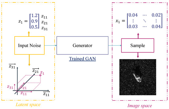 In [66], Kim et al. proposed a technique for adapting synthetic SAR images to measured SAR images using a complex value conditional generative adversarial network. This method aims to reduce the disparities between synthetic SAR images, which are generated by simulations and often used for training recognition models, and measured SAR images from real sensors. In the end, they proved that their adapted images can improve classifier accuracy compared with a classifier trained on real data. - Generating new dataThe second approach involves generating new data points after training on real data. In this case, we deal with “classical” types of data for the generator: we input noise into the generator in order to obtain images as outputs. In addition, in this paragraph, we are only going to focus on GANs that can “traditionally” generate SAR images and not on variants such as models based on a conditional GAN or InfoGAN [99] since they affect latent space (see Section 2.1).In [3], Zheng et al. proposed to train a dynamically adjustable multi-discriminator GAN in order to produce unlabelled images that are then labelled through label smoothing regularisation [4]. Then, these images are jointly used with real images to train a CNN devoted to SAR ATR. This work innovatively resorts to a multi-discriminator framework in a dynamic manner, enabling the generator to be exposed to the ensemble average of all discriminators and gradually to the best one during the rest of the training as the discriminators’ performances increase. This paper highlights the interest of using GANs to perform data augmentation for SAR ATR, especially in a case of semi-supervised learning.Conversely, Cui et al. [67] used a GAN variant called the Wasserstein generative adversarial network with gradient penalty (WGAN-GP-[103,104]) to generate new data. This model aims at improving the initial GAN architecture by: