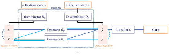 Figure 6. Guo et al. model architecture [62].By using a dual GAN, they constructed a symmetrical bridge between low and high signal-to-noise ratio (SNR) data, while incorporating a classifier for the recognition part that works on denoised data. They showed the interest of despeckling images in terms of classification.Conversely, Shi et al. [63] considered that low-resolution images were pre-processed SAR images masked with a computed binary mask intending to remove background. They trained a GAN to teach it to produce high-resolution images before feeding high-quality inputs to a deep CNN.Different again, Sun et al. [64] innovatively proposed using a conditional GAN (cGAN-[98])-based model to translate SAR images to the optical domain as a pre-processing step. In fact, the automatically translated images are then fed to a classifier. Their architecture is shown in Figure 7.