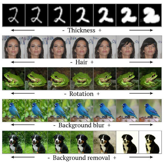 - Voynov, A.; Babenko, A. Unsupervised discovery of interpretable directions in the GAN latent space. In Proceedings of the 37th International Conference on Machine Learning, Online, 13–18 July 2020. [Google Scholar]