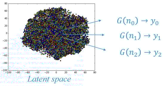 The aforementioned technique is replicated over a few epochs, after which false data are carefully checked to determine whether they appear as real. In case of satisfactory results, the training is ended. Otherwise, it proceeds for extra epochs. As seen below, jointly with GANs, the latent space is a key concept to open the black box, as stated in introduction. Latent space is a high-dimensional space in which lie the vectors inputted into the generator. After training, the generator provides an image from a point in latent space. In other words, one vector in latent space corresponds to an image in image space. Thus, latent space can be seen as a reduced dimension representation of the considered data and the generator as the bridge between them. Figure 3 intends to illustrate this definition.