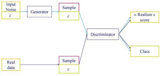 On the other hand, Ma et al. in [70] do not resort to transfer learning but rather to multi-task learning. They built a model inspired by the conditional GAN (cGAN) architecture and added another output branch to the discriminator dedicated to ATR (see also [106]). cGAN is a variant of its predecessor GAN, in which information, such as category or source, is added along the data flow. In this type of architecture, the discriminator does not only evaluate images, as with a vanilla GAN, but also pairs of data samples: data concatenated with c, the piece of information of interest. The architecture is shown in Figure 9.