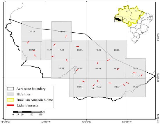 Location of the 20 airborne lidar transects (red bars) within Acre state in the Brazilian Amazon biome and the 17,110 × 110 km HLS tiles intersecting these transects. Transects A, B, and C are evaluated in detail in the Results section.