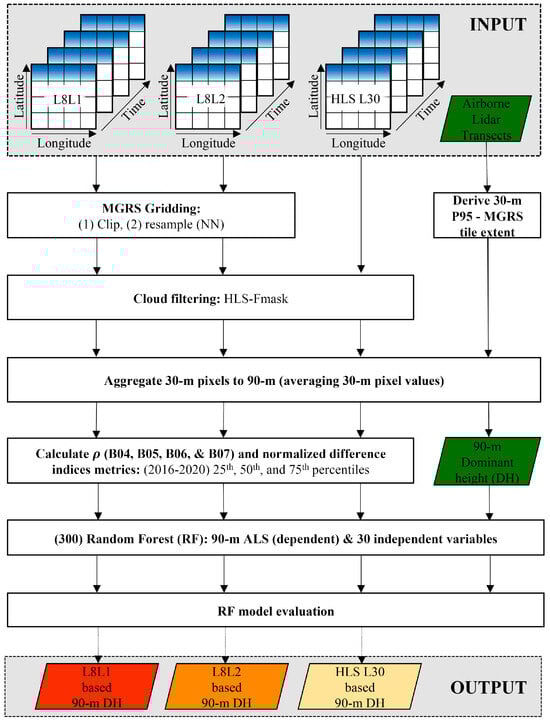 The main (pre-)processes to model dominant canopy height using L8L1, L8L2, and HLS L30 as independent variables. B04, B05, B06, and B07 are Landsat 8 red, NIR, SWIR 1, and SWIR 2 spectral bands.