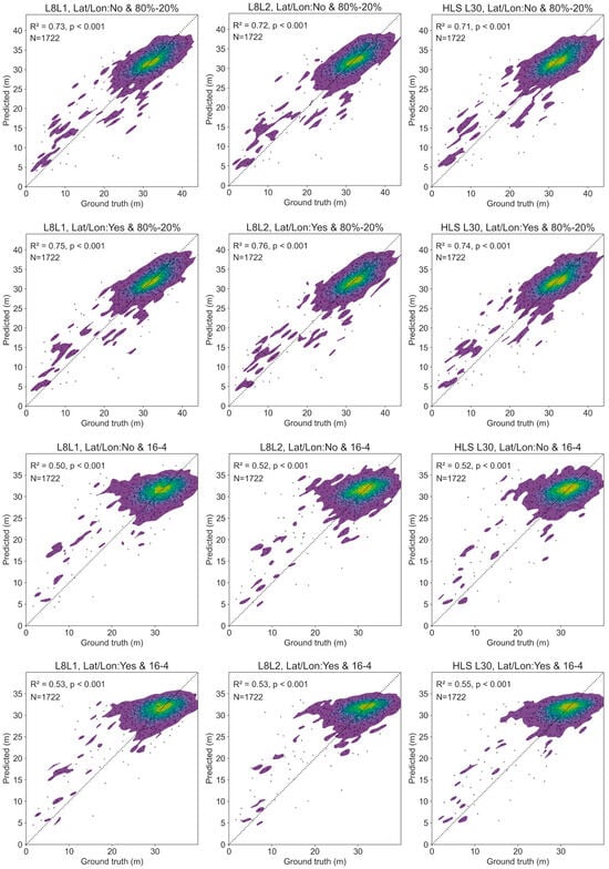 RF-predicted versus airborne lidar ground-truth DHs for Landsat 8 level 1 (L8L1), Landsat 8 level 2 (L8L2), and HLS L30 products. In the first and second rows, 80% of the randomly sampled observations from the 20 airborne lidar transects were used for training and 20% for testing the RF (80%-20%). In the third and fourth rows, the sampled observations from 16 transects were used for training and from 4 for testing the RF (16-4 spatial split). Latitude and longitude were not included (Lat/Lon: No) in the first and third rows and were included (Lat/Lon: Yes) in the second and fourth rows. All the RFs used a 50% sample size. The color gradient from dark blue to yellow shows increasing concentration of data points. Dotted line is 1:1 line.