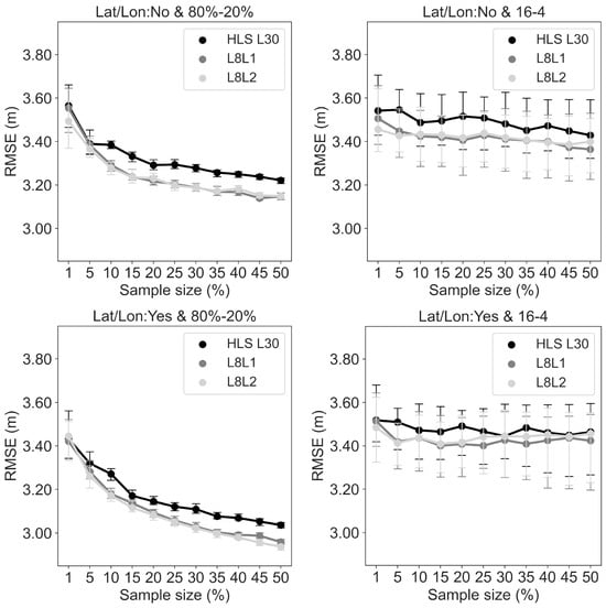 Sensitivity analysis of RF-dominant canopy height prediction root mean squared error (RMSE) sensitivity analysis to sample size for Landsat 8 level 1 (L8L1), Landsat 8 level 2 (L8L2), and HLS L30 products. In the left column, 80% of the randomly sampled observations from the 20 airborne lidar transects were used for training and 20% for testing the RF (80%-20%). In the right column, the sampled observations from 16 transects were used for training and 4 for testing the RF (16-4 spatial split). Latitude and longitude were not included (Lat/Lon: No) in the first row and were included (Lat/Lon: Yes) in the second row. Each dot is the median root mean squared error (RMSE), and error bars are 95% confidence interval.