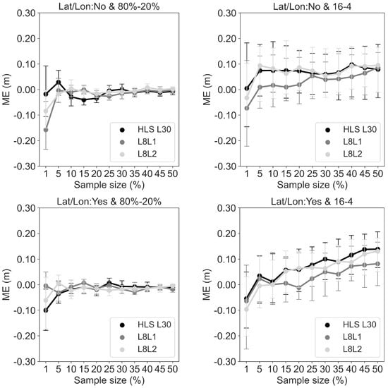 However, when the results of 300 RFs are combined for each sample size and sampling strategy, model errors (i.e., RMSE and ME) highlighted a variable effect among the different Landsat products. In the case of RFs that used an 80%-20% random split, the RMSE values (Figure 4) decreased with increasing sample sizes, as expected. RMSEs remained unchanged, considering a 95% confidence interval, for the RFs that used a 16-4 spatial split. The L8L1 and L8L2 products produced the same RMSE, considering the dispersion along the mean value in all the RF modeling experiments. The HLS L30 product had a similar RMSE to the L8L1 and L8L2 products when the RFs were modeled using spatial 16-4 training and test split. However, it generally had higher RMSEs when employing an 80%-20% random split and sample size ≥ 10%. The MEs in Figure 5 indicated no bias when RFs used an 80%-20% random split and sample size ≥ 5%. In RFs that used 16-4 spatial split and included latitude and longitude, the MEs of L8L2 and HLS L30 were positively biased (i.e., RF predicted DH mostly greater than observed DH) at sample sizes ≥ 30%. Without including latitude and longitude in RFs, all Landsat products were unbiased, considering a 95% confidence interval.