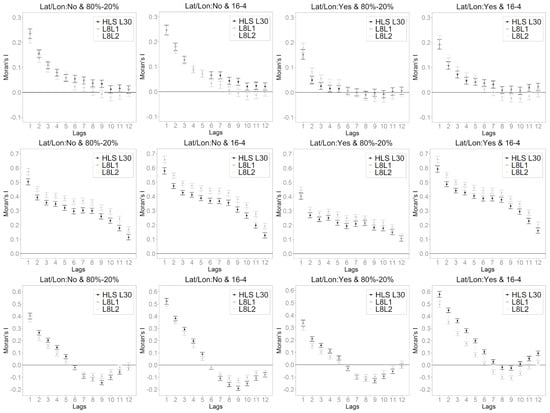 Spatial autocorrelation on the average residuals of 300 RF models using L8L1, L8L2, and HLS L30 products at Transects A (top row), B (middle row), and C (bottom row) (see Figure 1). The sample size of the RF models was 50%. Results are displayed in terms of training/test strategy and inclusion or not of latitude and longitude as independent variables. Latitude and longitude were not included (Lat/Lon: No) in the first and second rows and were included (Lat/Lon: Yes) in the third and fourth rows. Each lag indicated a distance corresponding to a 90 m pixel times the lag value (i.e., 90–1080 m range).