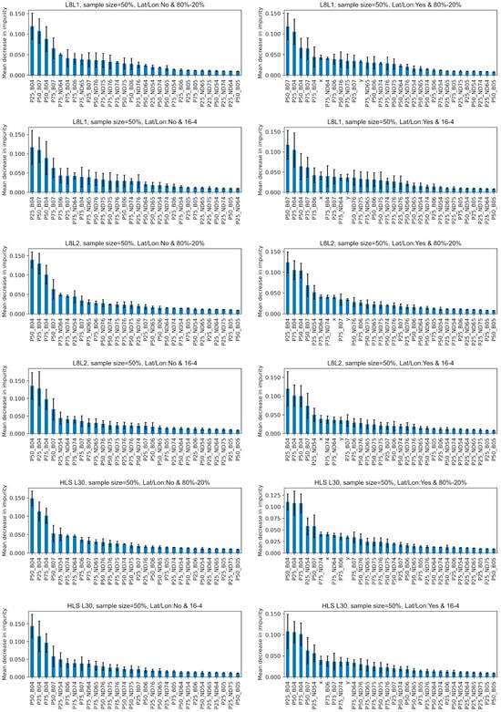 The independent variables most important to the RF models are illustrated in Figure 7. In all scenarios, such as the 80%-20% random split with and without latitude and longitude and the 16-4 spatial split with and without latitude and longitude, different percentiles of B04 and B07 became the most important variables for DH modeling. In the case of RF models using L8L1, B07 presents greater importance than RF models using L8L2 and HLS L30. Latitude and longitude, when included, demonstrated a moderate level of importance, falling between the 5th and 11th positions.