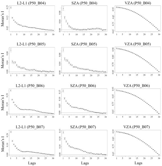 Spatial autocorrelation intrinsic to L8L1 temporal metrics product. In the left column are the Moran’s I correlograms showing the difference between the L8L2 and L8L1 (L2-L1) red, NIR, and SWIR bands. In the middle column is the solar zenith angle (SZA) and in the right column is the view zenith angle (VZA) red, NIR, and SWIR band correlograms. Here, only correlograms representing the 50th percentile (P50) of temporal metrics for Transect A are included. Each lag indicates a distance corresponding to a 90 m pixel times the lag value (i.e., 90–2700 m range).