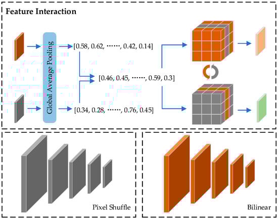 where and denote the outcomes of the upsampling using the Pixel Shuffle and Bilinear methods, where . Then, the channel information interaction module is applied to exchange channel information on the upsampled results, and , as illustrated in Figure 4 in detail.
