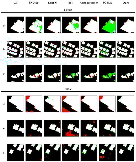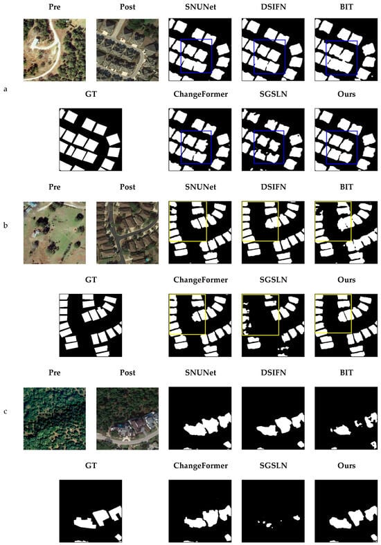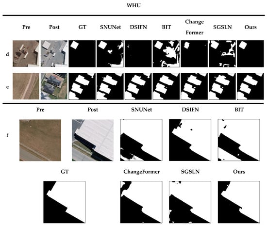 Qualitative results: As shown in Figure 5, on the LEVIR dataset, the change areas in images a and b exhibit denser and more regular boundaries. In image a, the SGSLN model exhibits suboptimal detection in the region highlighted by the blue box. This is due to the influence of the house shadow, resulting in fragmented results and an inability to accurately delineate the change area. Similarly, the SNUNet, DSIFN, BIT, and ChangeFormer methods are also affected by the shadow in this region, exhibiting varying degrees of overlap in their detection outcomes and poorly distinguishing change areas. In contrast, the proposed method demonstrated superior visual performance with minimal connected areas. Similarly, in image b, the proposed model outperformed the others significantly in the yellow box. The change area in image c presents an irregular shape, posing greater detection challenges than the first two images. However, the results illustrate that the proposed model exceled at capturing the region and preserving the shape of the change area, exhibiting no instances of missed detection or blurred boundaries. The WHU Building dataset features larger change areas with a more regular pattern than the LEVIR dataset. Figure 6 shows the results for the WHU dataset. In images e and f, it is evident that the proposed model provided more comprehensive predictions of change areas and achieved greater accuracy at the boundaries.