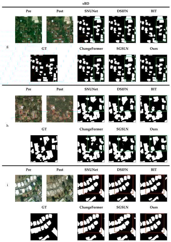 The xBD dataset presents denser and smaller change areas characterized by numerous irregular shapes than the LEVIR dataset. Similar to the above, superior results were achieved by the proposed model when facing these challenges. As shown in Figure 7, the region highlighted by the green box in image g reveals that all the models except ChangeFormer generated false detection results, erroneously identifying the top portion of land as a change area. Despite ChangeFormer having better performance in discerning change areas, its edge prediction notably lagged behind that of the proposed method. Likewise, within the green-marked area in image h, only the proposed method achieved exceptional detection outcomes for the irregular segments within the change area.